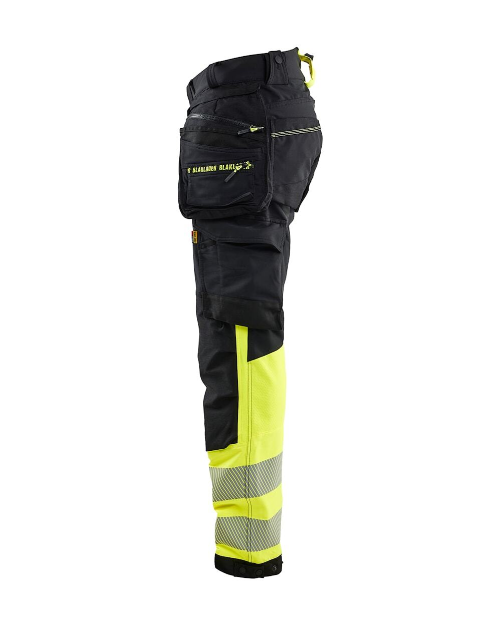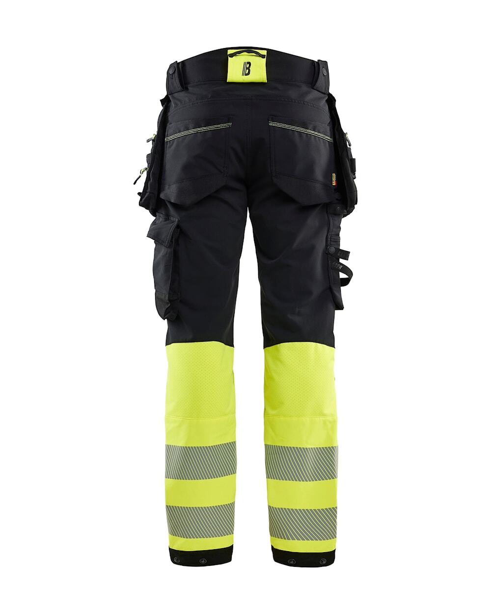 Highvis työhousut erittäin pehmeää ja neljään suuntaan joustavaa materiaalia antaa maksimaalista mukavuutta ja näkyvyyttä, kun sitä eniten tarvitaan. Housuissa on katkonaiset heijastimet, irralliset riipputaskut, korkea vyötärö takana, tummat alueet lialle altistuvilla alueilla sekä tuuletusaukot takana ja polvissa. Polvisuojataskut mukavaa CORDURA® stretch -materiaalia.