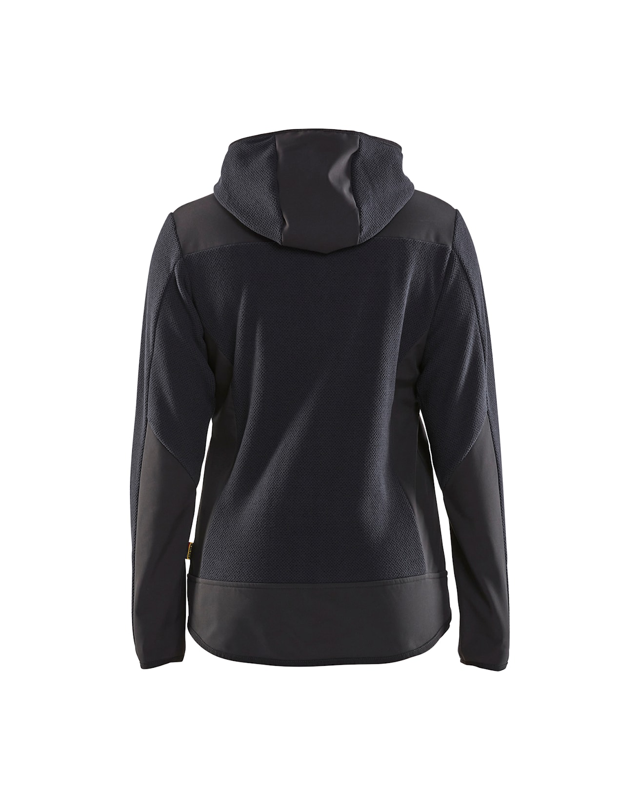 Neulottu naisten takki hupulla, nuorekkaalla ilmeellä ja mukavan tuntuisella fleecemateriaalilla. Takissa on kaksisuuntainen vetoketju edessä ja materiaali on uutta, kolmiulotteista fleeceä. Harjattu materiaali antaa takille makean ilmeen 3D-kuviolla, materiaali on joustava, mukavan tuntuinen ja lämmin. Softshell-materiaali hihoissa, hartioilla ja selän alaosassa antaa lisäkestävyyttä. Kainaloissa ei ole softshelliä, mikä parantaa hengittävyyttä. Takissa on paljon tilaa painatuksille ja sopii niin työhön kuin vapaa-ajalle.