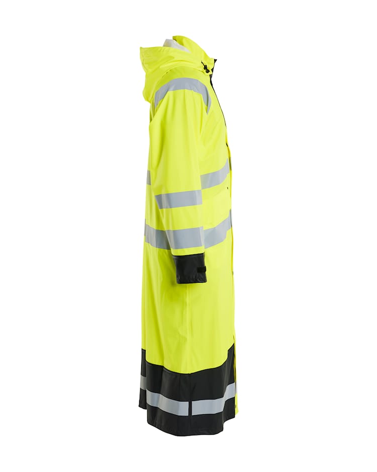 Pitkä sadetakki huomiovärillä työtehtäviin, jotka vaativat kevyttä ja pehmeää sadevaatetta. Tuulen- ja vedenpitävä, liimatut saumat. Huppu on irrotettava ja säädettävä. Helppokäyttöiset läpälliset etutaskut, kaksisuuntainen ylös kaulukseen asti ylettyvä vetoketju listan alla. Hyvä istuvuus tarralla säädettävillä hihansuilla. Sertifioitu EN 343 (suojaus sateelta) ja EN ISO 20471, luokka 3 (näkyvä varoitusvaatetus ammattikäyttöön). Väri 3300 on poistuva malli. Lisätietoja kyseisestä tuotteesta voit katsoa kuvastosta 2017. Värin 5300 malli on päivitetty. Aikaisempaa mallia toimitetaan niin kauan kuin varastoa riittää.Hitsatut saumat