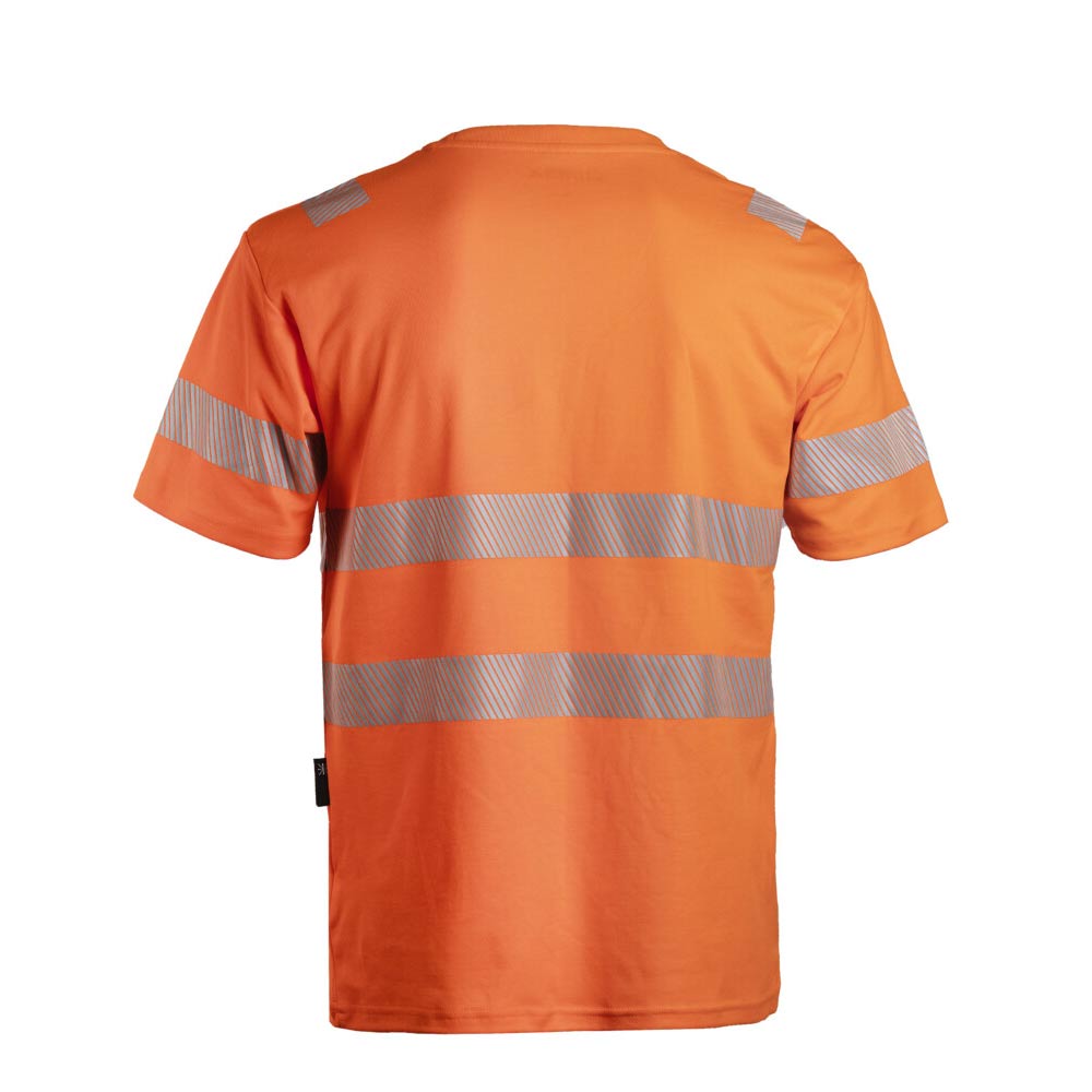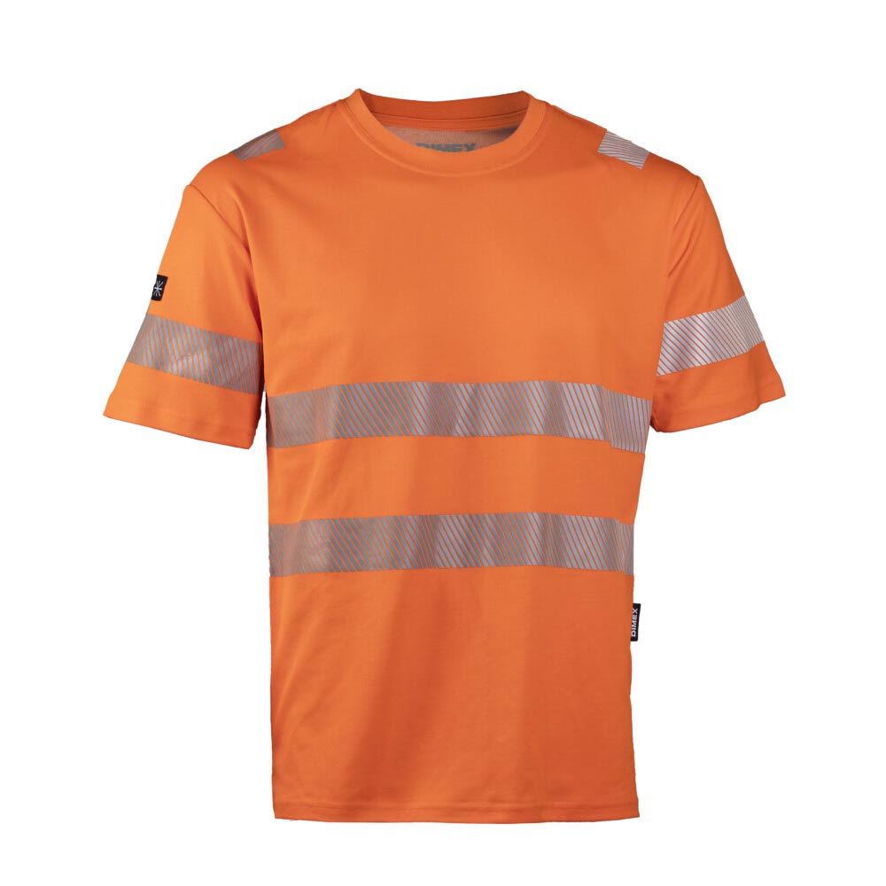 Huomiovärinen T-paita painetuilla heijastimilla. Mallissa myös olkaheijastimet. Mukavan tuntuista puuvilla-polyesteri sekoitemateriaalia.