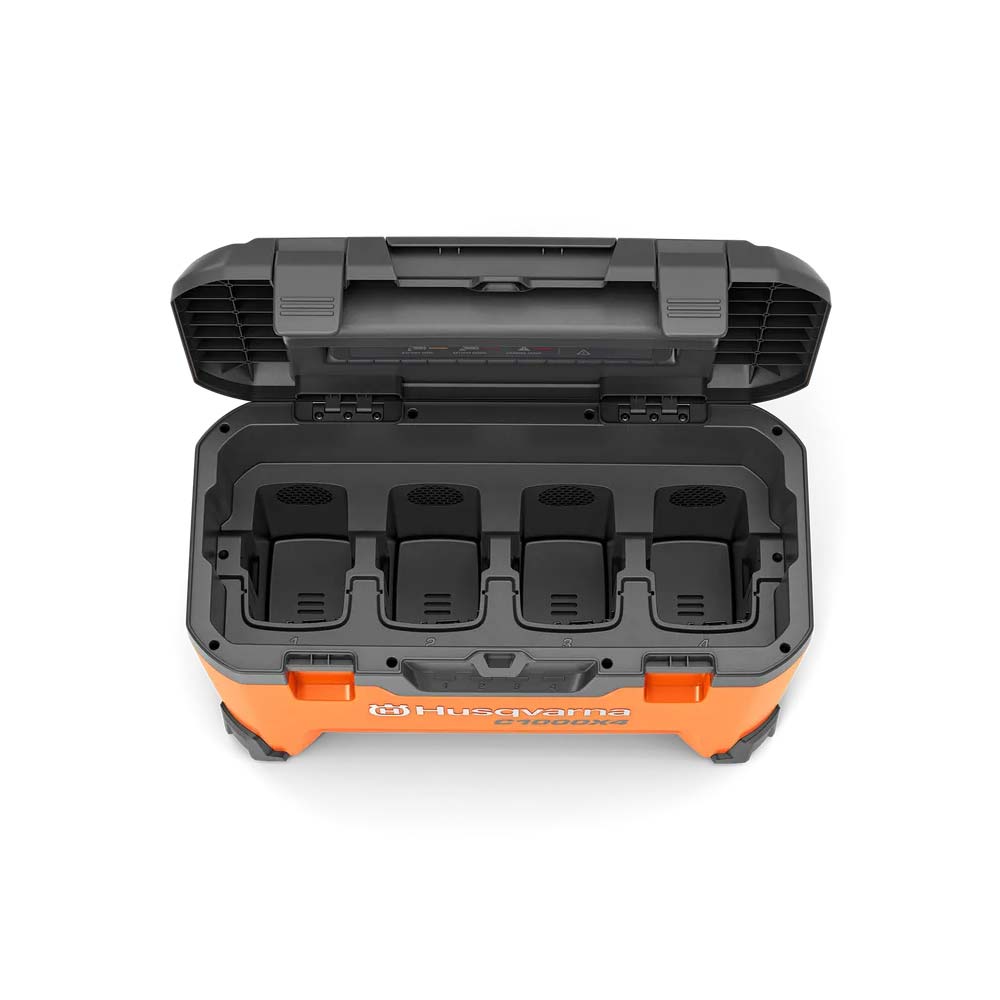 Husqvarna 40-1000X4 monipaikkainen lataus- ja kuljetuslaatikko akkujen lataamiseen missä tahansa – työpajassa, työmaalla, autossa tai perävaunussa. 40-C1000X4 mahdollistaa jopa neljän Husqvarna BLi-X 36V akun samanaikaisen ja helpon latauksen yhdessä yksikössä. Älykkään kuormituksen tasapainotuksen ansiosta kaikki akut latautuvat nopeasti ja tehokkaasti. Täyttää IPX4-luokituksen vedenpitävyyden suhteen, joten se sopii käytettäväksi kaikissa sääolosuhteissa. Lataus-, kuljetus- ja säilytys – tämä monipaikkainen laatikko tarjoaa all-in-one-ratkaisun helppoon akkujen käsittelyyn. Akut myydään erikseen.