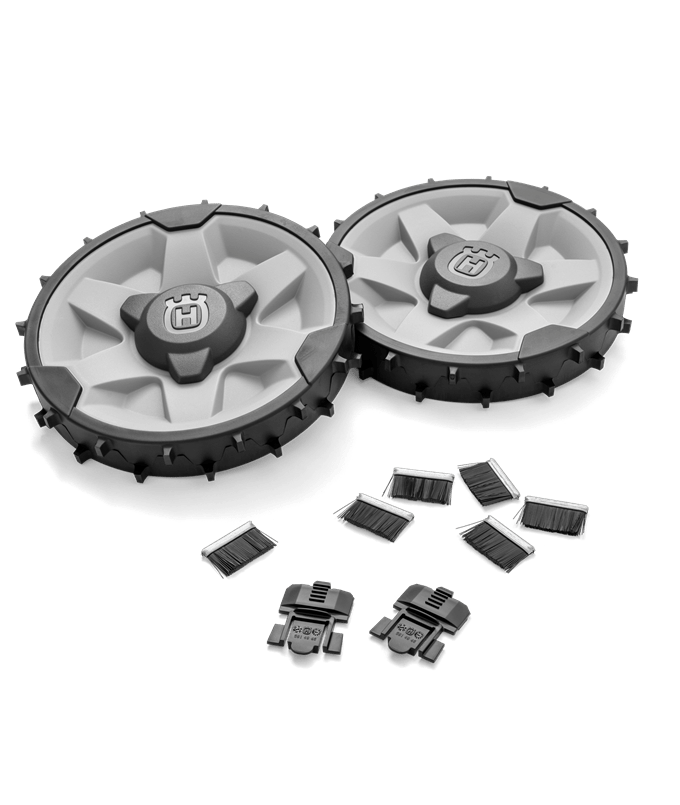 Sarja sisältää painavat takapyörät ja pyöräharjat, jotka varmistavat hyvän pidon rinteisellä nurmikolla.