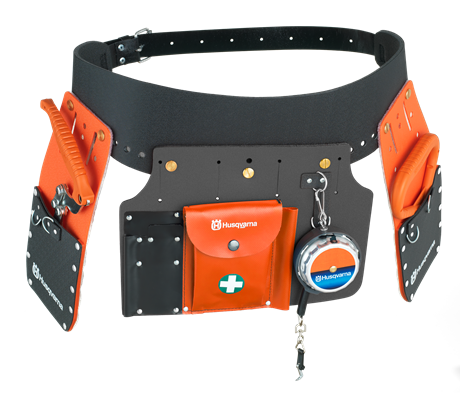 Täydellinen työkaluvyö sisältää tukivyön, mitan, kaksi koteloa, nostokoukun ja pinotavarasakset sekä takakappaleen.