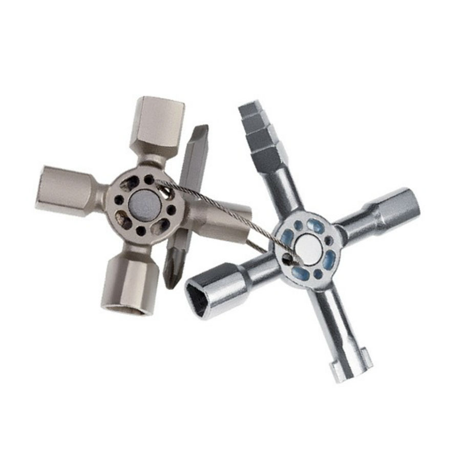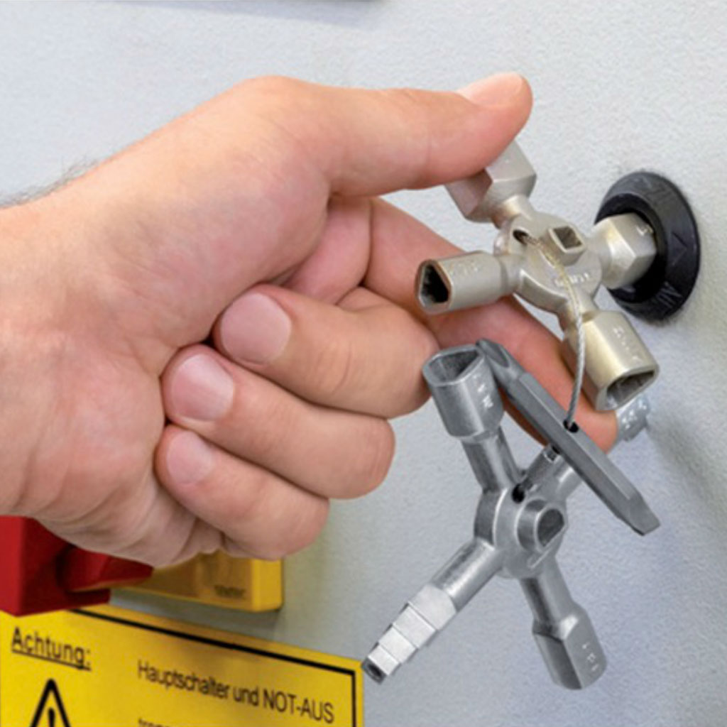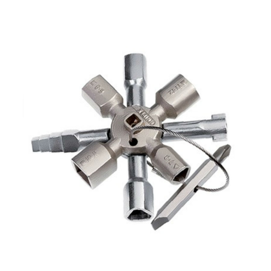 Knipex kaksiosaisessa kaappiavaimessa kymmenen erilaista profiilia sekä ruuvauskärki 7,0/PH2. Vahva magneetti pitää avaimen puoliskot kiinni toisissaan.