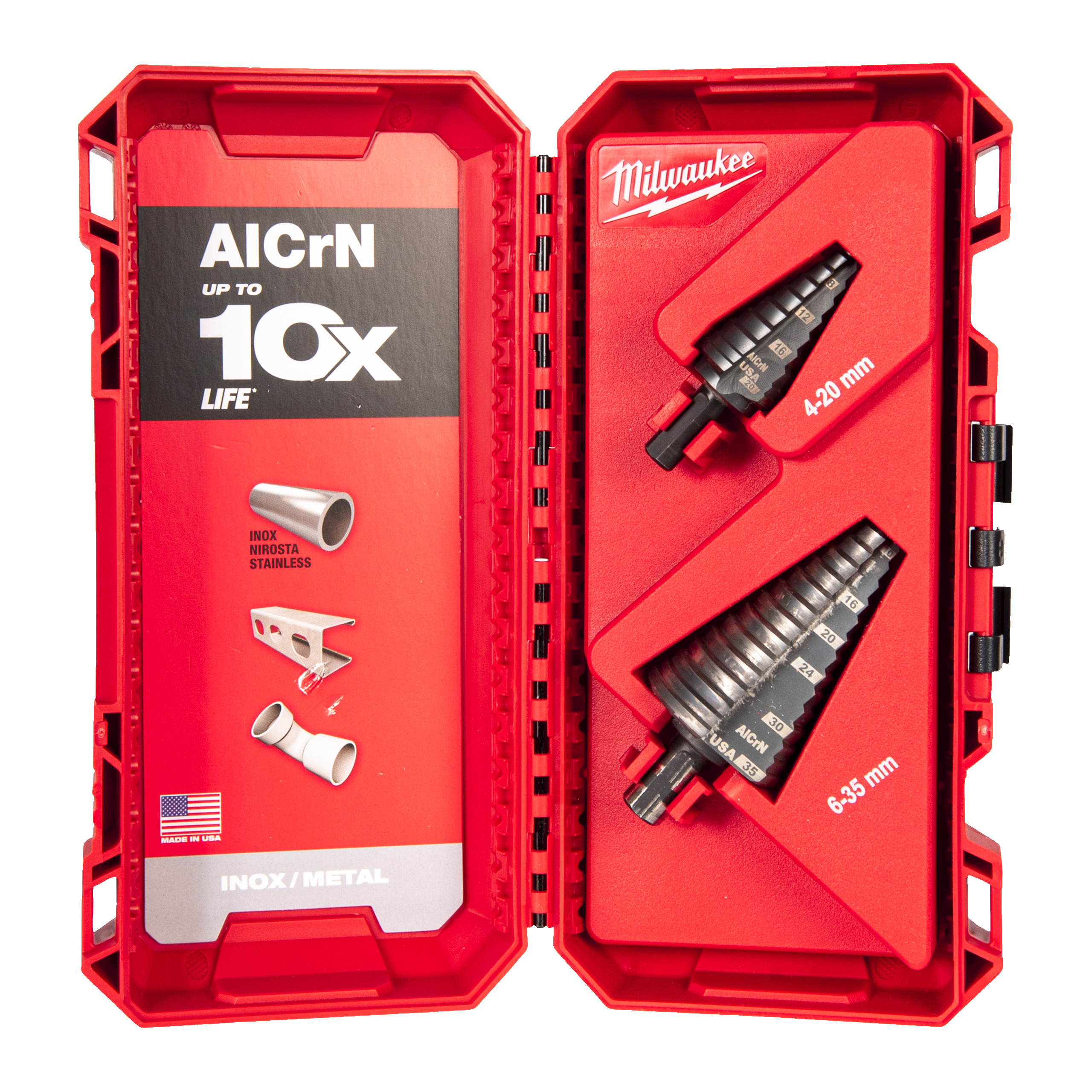 Uusi alumiinikrominitridipinnoite (AlCrN) pidentää terän käyttöikää 10x verrattuna tavallisiin MILWAUKEE®-porrasporanteriin. Soveltuu teräkselle ja ruostumattomalle teräkselle. RAPID STRIKE TIP™ helpottaa ruuvaamisen aloittamista, estää terän liikkumista ja vähentää lämmöntuottoa ruuvatessa. Erikoissuunniteltu kärki ja porrasgeometria pienentävät poran jumiutumisen riskiä akkutyökaluja käytettäessä ja estää porattavan materiaalin vääntymisen. Optimoitu 2 avautuman teroitettu särmän geometria mahdollistaa 2x nopeamman ja sujuvamman poraamisen. 3 tasaista puristinta estävät porrasterää lipsumasta istukassa ja varmistavat vääntömomentin mahdollisimman hyvän siirtymisen. Laserkaiverretut kokomerkinnät pysyvät näkyvänä pitkään. 2 x kobolttiporrasporanterät 4 – 20 mm / 6 – 35 mm