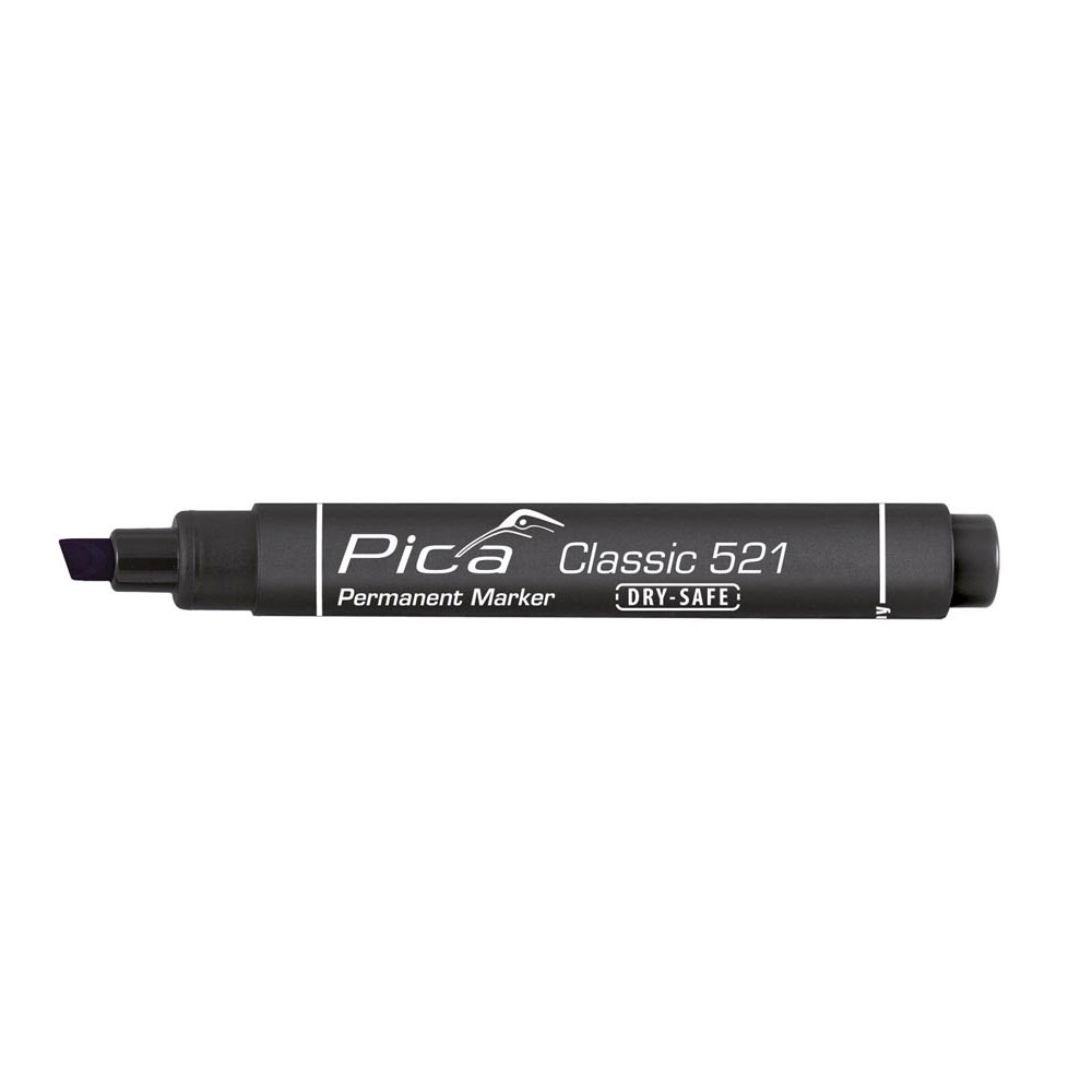 PICA huopakynä Classic 521, viistokärkinen. Permanentti, alkoholipohjainen vedenkestävä huopakynä. Soveltuu hyvin kiiltäville ja huokoisille pinnoille, esim. metalli, tiili, kumi, puu, lasi, kaakeli. Nopeasti kuivuva muste, ei sisällä tolueenia tai ksyleeniä. Kestää kuivumatta jopa 14pv ilman korkkia.