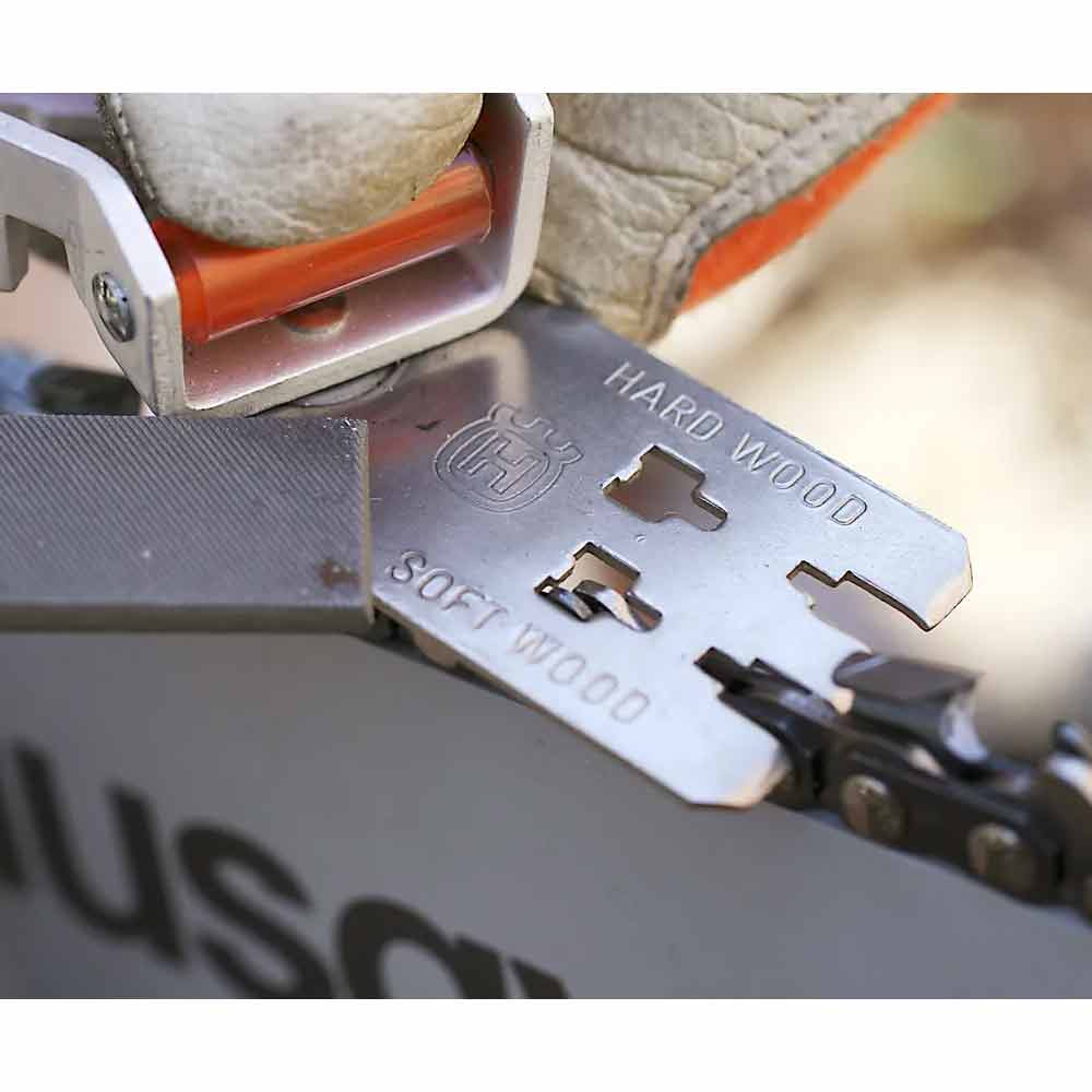 Husqvarnan yhdistelmäviilanohjaimessa on yhdistetty viilaohjain ja alennuskaavio. Käytetään pyörö- ja lattaviilan kanssa oikean viilauskulman saamiseksi. Saatavana kaikkiin Husqvarnan teräketjuihin.