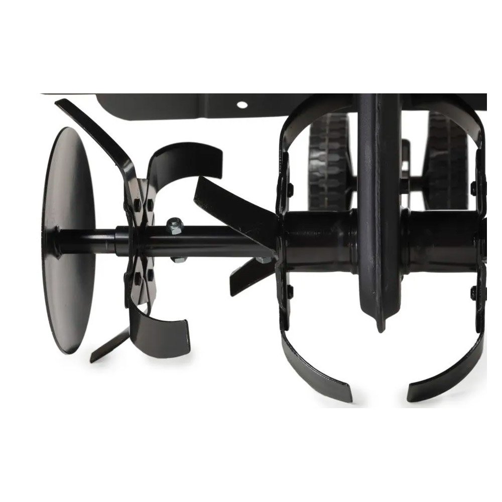 Jyrsin, jossa on 123 cc polttomoottori, 50 cm työleveys, 20 cm työsyvyys, neljä metalliroottoria ja kaksi kuljetuspyörää takana.